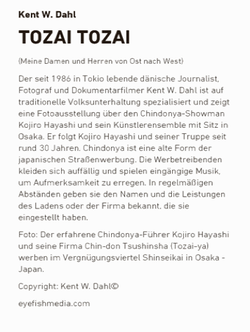 The Tokyo-based Danish journalist, photographer and documentary filmmaker, Kent W. Dahl, features the chindonya showman, Kojiro Hayashi, and his Chin-don Tsushinsha (Tozai-ya) troupe based in Osaka.